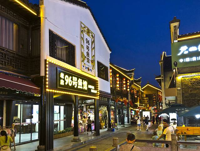 本就在乎累犹豫着,那就算了吧。对面的汴河街灯光不错,是一条仿古老街巷,走进去逛逛又买了两样特色小吃。就到了巴陵广场,本是我明天的节目。