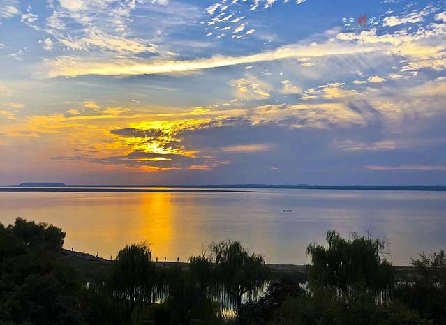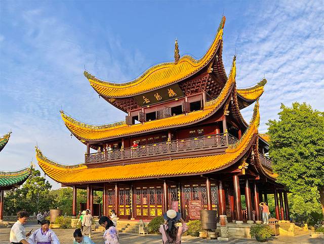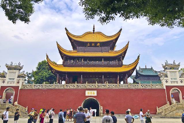 这时夕阳西下,岳阳楼被披上了一身金光,黄色琉璃瓦靓丽得耀眼。岳阳楼始建于东汉建安二十年(215年),历代屡加重修,外观完全不同,清代就有两个,现存建筑沿袭清光绪六年重建时的形制与格局,通常叫它晚清岳阳楼。