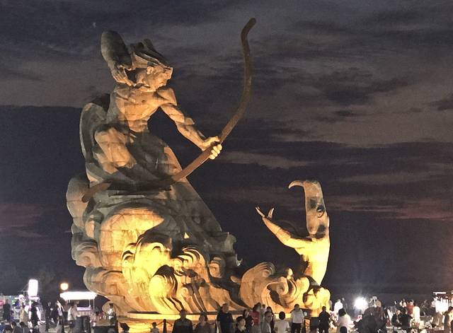穿过瞻岳门到了广场,挺热闹但不亮堂。后羿斩巴蛇的大型雕像也黑呼呼的,它是根据古代传说夏后羿曾斩巴蛇于洞庭湖,积骨成丘陵而得名,如今成了岳阳的城市标志。