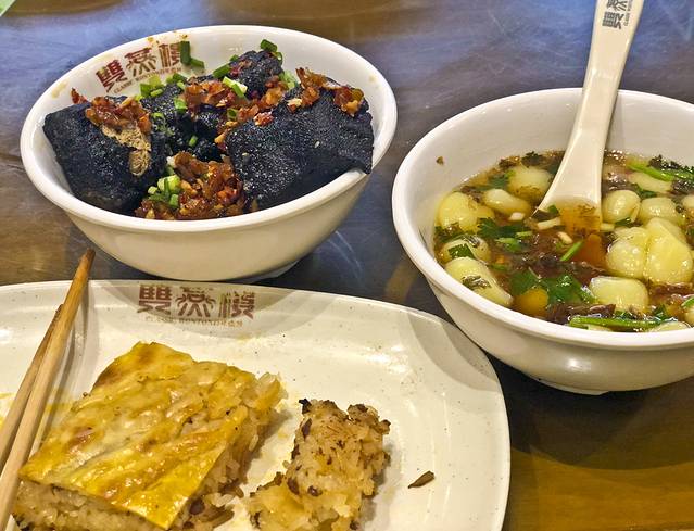 在潮宗街口双燕楼吃了3样小吃,其中臭豆腐一般,感觉还没有桂林的好吃。豆皮糕不错,新颖口感不错。最差的是那个带汤的,叫什么忘了,汤就是馄饨汤,东西软软的没劲道,不知是什么面做的。