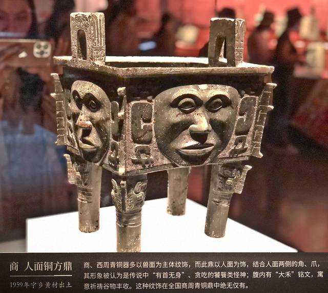 大禾人面纹方鼎,商代晚期文物,口长29.8厘米,宽23.7厘米,通高38.5厘米,约1958-1959年于宁乡县(今宁乡市)黄材镇胜溪村出土。大禾人面纹方鼎颜色碧绿,器身略呈矩形,口部略大于底部,两耳直立,四柱状足,足上部有兽面纹,器身外表四周饰半浮雕的人面。人面周围有云雷纹,人面的额部两侧有角、下巴两侧有爪。