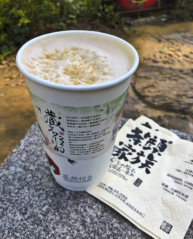 欣赏拍照后,在附近买了杯“茶颜悦色”的奶茶,这是长沙最火的奶茶品牌了,满大街都是。味道不错,包装精细。找个地方坐下,边喝边欣赏爱晚亭。