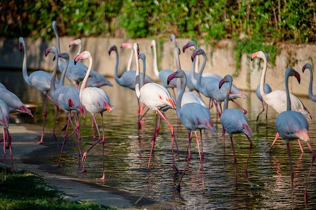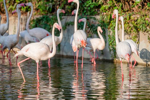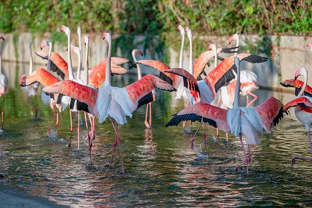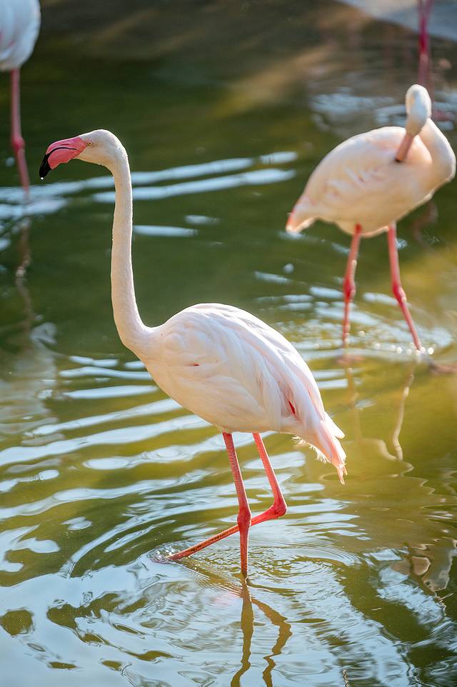 火烈鸟的羽毛以粉红色为主,这种独特的颜色让它们在水中显得格外引人注目。