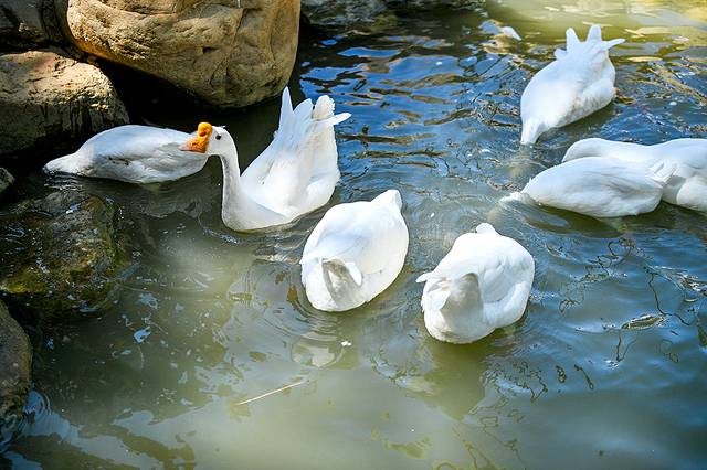 除了孔雀外,雀鸟天堂还栖息着天鹅、红头潜鸭、绿头鸭、珍珠鸡、红腹锦鸡等多种珍稀雀鸟。这些雀鸟在园区内自由飞翔、觅食,带来了沉浸式的观赏体验。