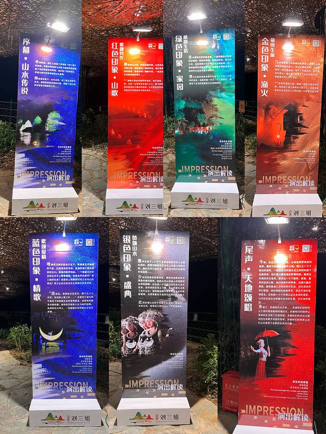 因为比较艺术,看之前一定要做功课不然看不懂。进去也有简单的介绍。有“红色、绿色、蓝色、金色、银色”五大主题色彩系列,一共7个篇章。有刘三姐的山歌,漓江渔火等。的确是很震撼。有一种别样的观感,我觉得很值得看。