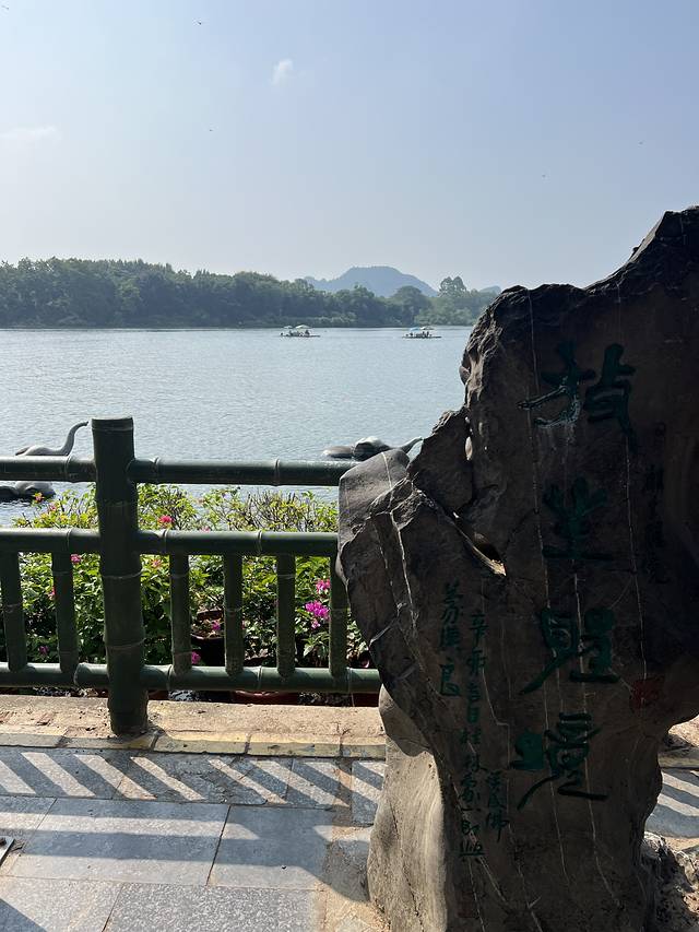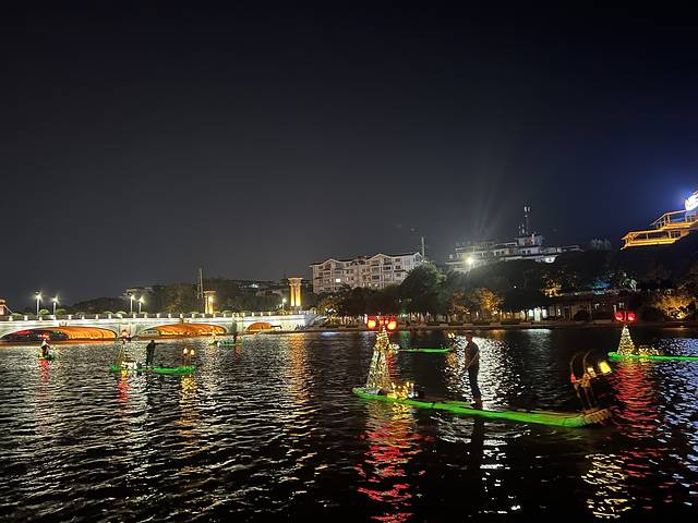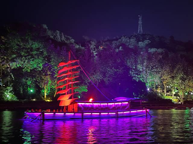 18:20吃完去坐船夜游两江四湖啦。网上订票185元。两江四湖指的是:漓江、桃花江,桂湖、榕湖、杉湖、木龙湖。 可游览三个主景区,榕杉湖景区,是中国古典式的园林景观;桂湖景区,天人合一的生态园林景色;木龙湖景区,宋历史文化园。乘船夜游,可观赏到象山、伏波山、叠彩山、尧山、宝积山、老人山等十多座传统名山。还有玻璃桥、丽泽桥、湖心岛、榕湖榕溪桥等各具特色的桥洞。夜晚灯光亮起,不用走路就可以悠闲的欣赏桂林美景。