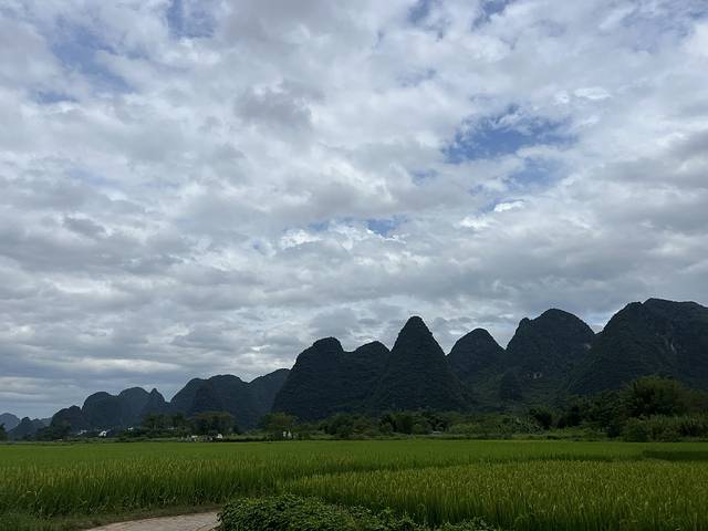 今天要去阳朔玩啦,阳朔离桂林有80公里左右,虽然有人选择一日游但是因为桂林很多精华景点都在阳朔,所以建议还是在那住1-2晚。我直接约的网约顺风车55+10国道费用, 9:00出发,11:00到朋友开的民宿。朋友已经准备好了电动车给我们骑,正常租是30元。也可以租那种三人坐小摩托,要150-180一辆,在稻田拍照也更好看。