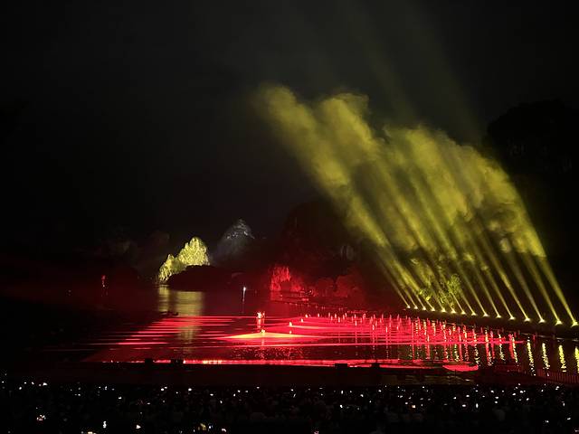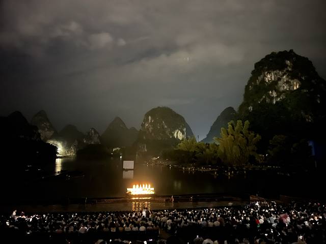 以方圆两公里的漓江水域,桂林十二座背景山峰,广袤无际的天穹,一起构成迄今世界上最大的山水剧场,讲述的是刘三姐的故事,有600个当地村民做演员的强大阵容。