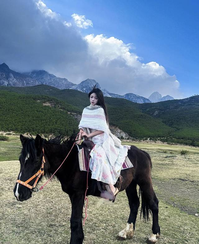 保留着原始纳西族风情蓝天白云映衬下在入口有观光车/骑马