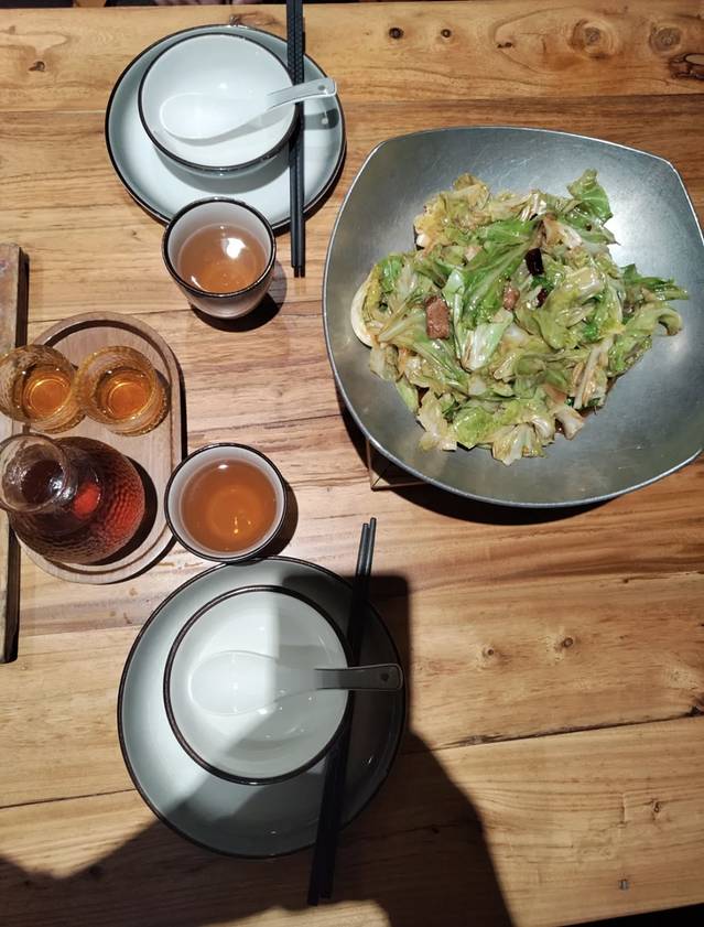 口味:点了手撕包菜,包浆豆腐,芦笋羊肚菌,小锅饭,椰香泡鲁达,普洱果酒,打卡送了一个奶白酒,我们口味偏清淡,觉得都很好吃。尤其推荐小锅饭,里面有锅巴和火腿,味道和口感不错。
