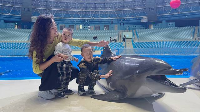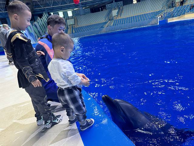 看了海狮,海豚表演后,哥哥提出要喂海豚,弟弟点头表示赞同,妈妈忍痛消费268,满足了两个小朋友,但比起其他海洋馆,这个还是很有性价比的。工作人员还让海豚给我两个宝宝安排了个爱的亲亲,海豚亲上宝宝手的那一刻,他开心坏了,这画面真美好