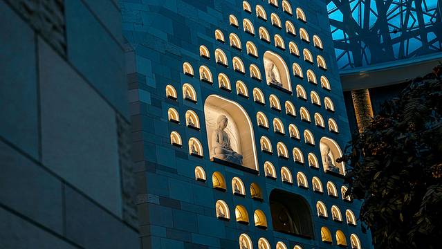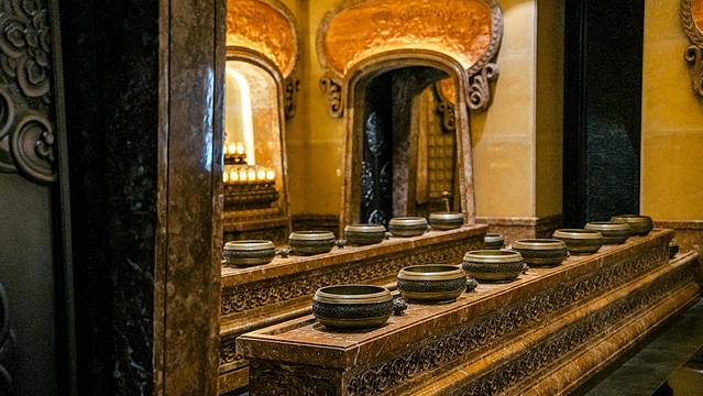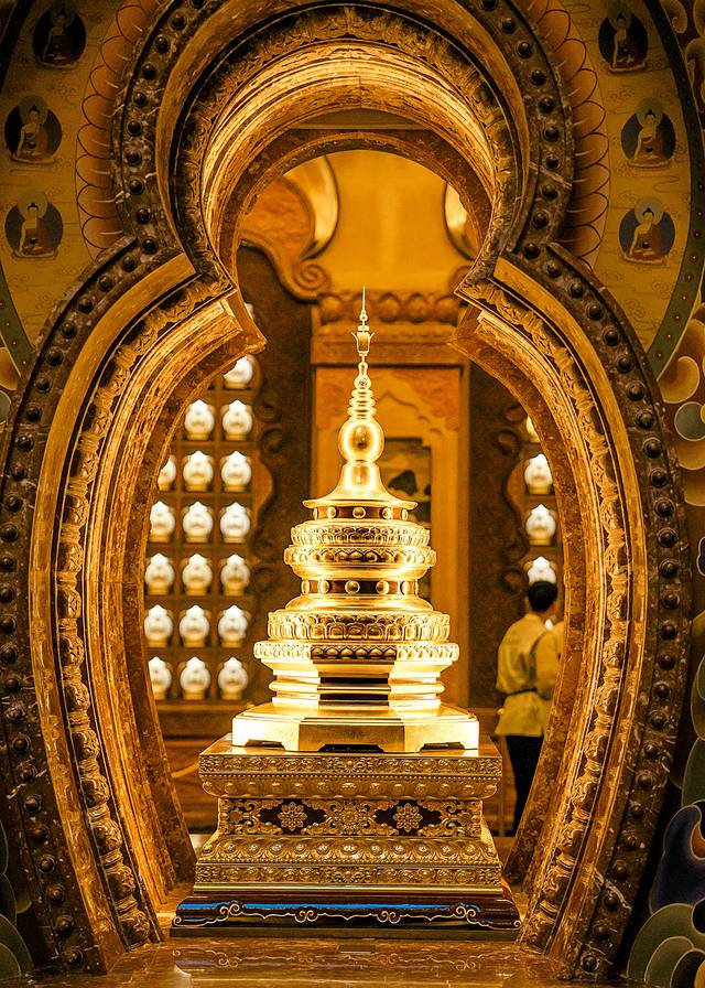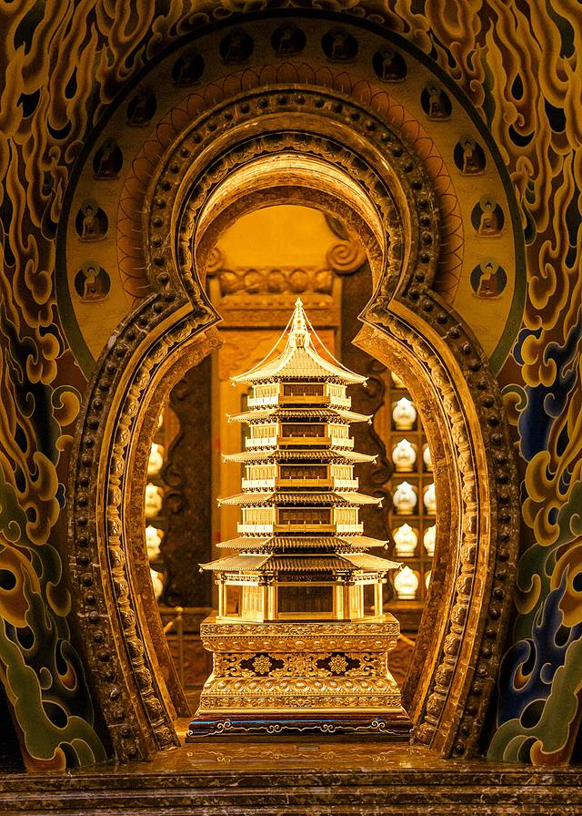 在佛顶宫,除了欣赏它的艺术美术造诣,最重要的,当然还是内部的景观。整个佛顶宫内部空间共九层,地上三层,地下六层,由禅境大观、舍利大殿和舍利藏宫三大空间构成,除了视觉上带给我们的极具震撼的佛教建筑美学,这里还收藏着不计其数的艺术珍品,这些珍品由全国100多位工艺美术大师、专家、学者和非遗传承人共同打造,为我们呈现了一场精彩绝伦的艺术盛宴!