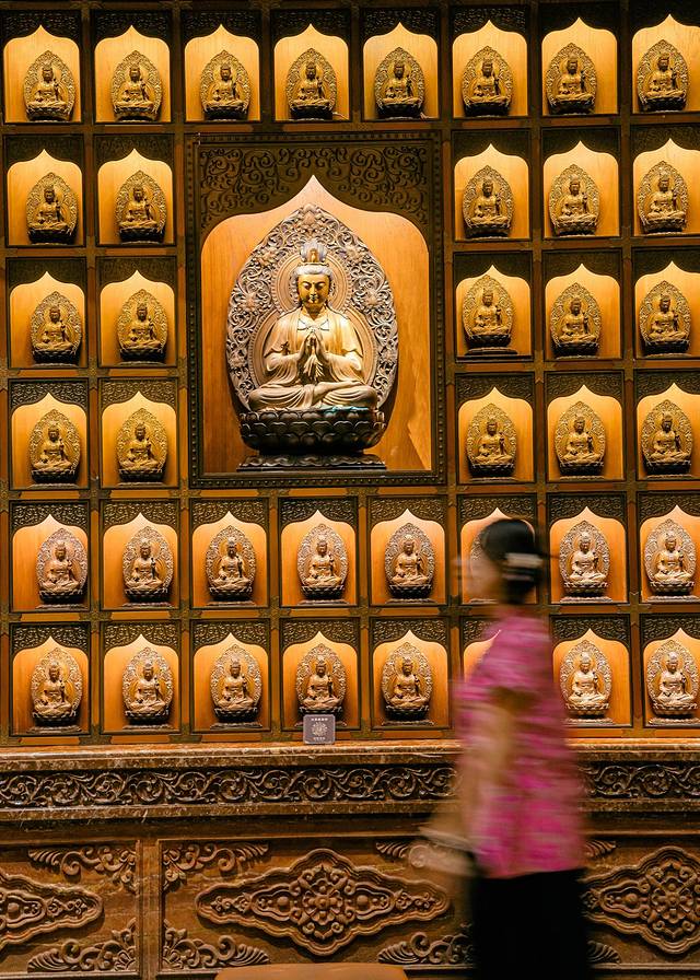 顺着指引继续往下走,是一层又一层的礼佛空间,外圈是万佛廊,这里供奉了十二生肖本命佛,还有许多庄严肃穆的佛教造像,气势恢宏,精美雕琢,巧夺天工,藏匠心于细节之中。
