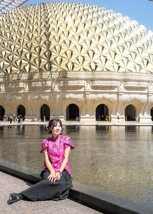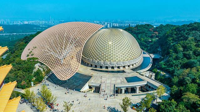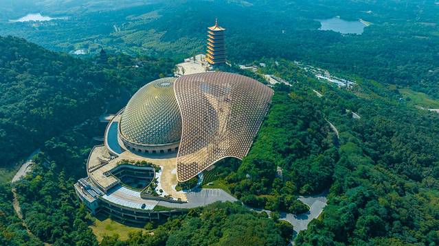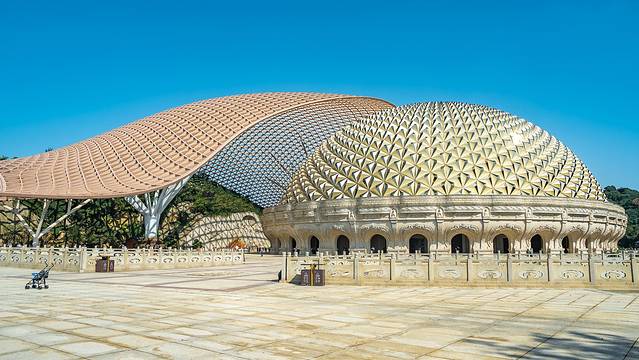 它的整体造型是一个椭圆形的球体,顶部几何造型的排布整齐划一,网友们都亲切的称它为“大榴莲”,不但形状可爱讨喜,几何造型也充分利用了光的折射原理, 当阳 光晴好的时候,整个佛顶宫顶部吸收着阳光的照拂又折射出熠熠光辉,果然,建筑美学设计的静妙,存在于每一个细节之中!