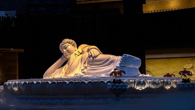 初入佛顶宫,映入我们眼帘的,就是这个充满无限禅意的禅境大观,巨大的卧佛,幽蓝的穹顶,四壁一尊尊壁龛佛像,瞬间将我们带入宁静之界,再躁动的内心,也立刻平静下来,让我们从这里开启一场静心之旅的参观游览吧!