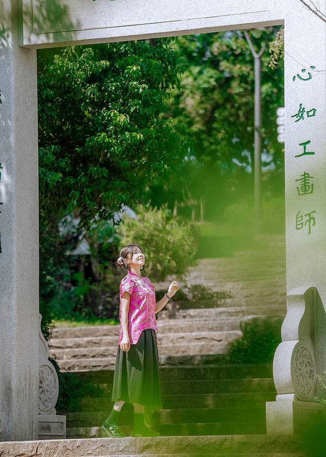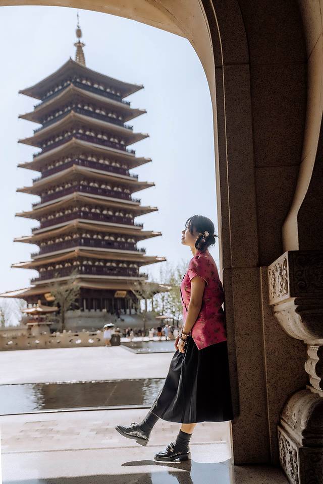 其次,走进环廊里,依然是在能够看到佛顶塔的那一侧,利用环廊的拱形框架,将佛顶塔和你自己定格在一张照片里。