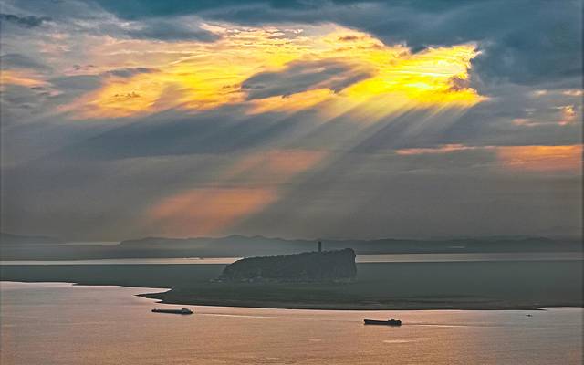 一束耶稣光,完美了鞋山岛,轻舟、湖泊、湖中仙山,一幅完美的自然之卷。