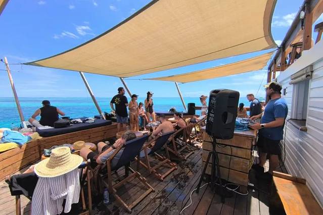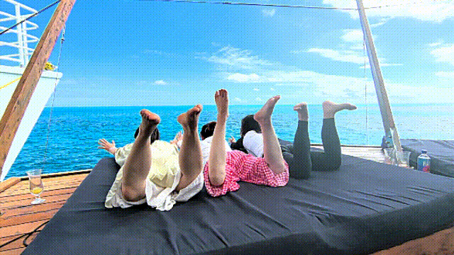 Cloud 9是一个两层海上浮台,目测大概150平方米左右呈现正方形。一层侧是一片面海“大通铺”卧榻,中间是舞池和DJ音乐工作区;一侧是吧台、小厨房和餐桌椅,还有船靠岸的小码头,和一个可供游客直接上下水的楼梯。二楼则是一整片卧榻,还有一个让你表演“跳海”的舞台。