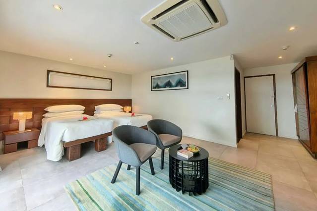 因为是一岛双酒店的低密度配置,托阔里奇岛喜来登度假村是一组沿沙滩海岸线而建的细长结构:餐厅、房间、泳池都是全线海景,往内部而行还有儿童乐园、SPA、球场和巨大的热带花园。