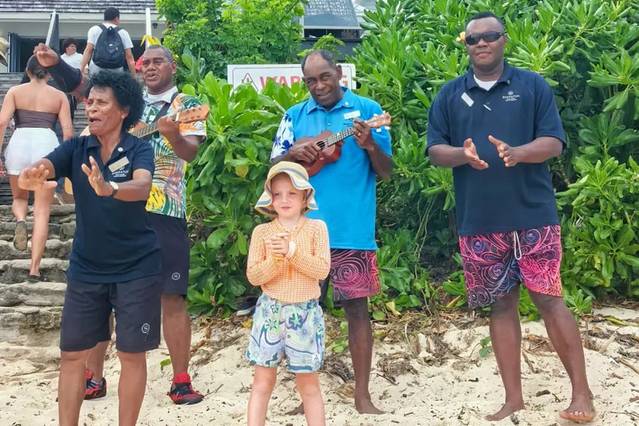 我们在登岛的那一刻,就被穿着传统服装载歌载舞、吹着号角的酒店工作人员热情欢迎了!岛上还有些可爱的游客孩子们也加入到迎宾大部队,气氛一下子就奔放了起来!
