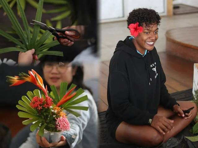 这天我们恰巧遇上了酒店免费为住客提供的传统花艺课程,一起跟着斐济本地的艺术家学习相传的斐济花艺手艺,收获太多了!