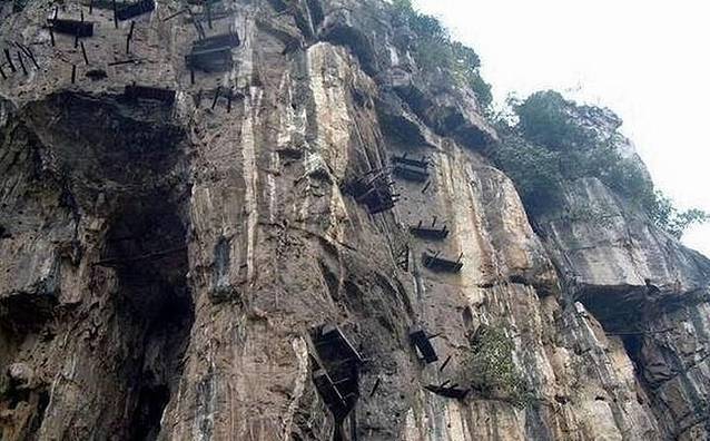 探寻了巫溪的悬棺奥秘,悬棺是古代人用多个安放在山顶的辘轳,先将人系住从山顶下到悬崖有洞处选址或者选址做洞,再做好接棺的辅佐事项。然后再将棺木吊下,棺木另外还有几条牵引绳,牵引绳由洞内的人用钩子钩住再由洞内的人合力拖入洞内。