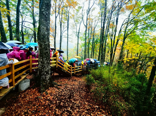 我个人觉得天然画廊的秋景是今年米仓山旅游景区最好看的地方,当天就算是下雨,人也没有减少,一波一波的人顶着雨衣在天然画廊中前行,时不时的还发出惊叹声,大家站在细雨中赏景,倒有一份独特的诗意。