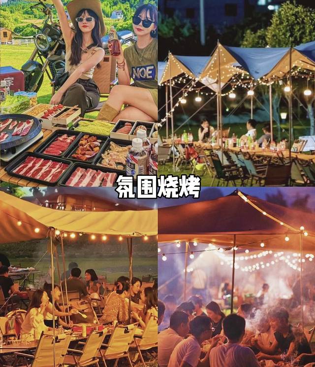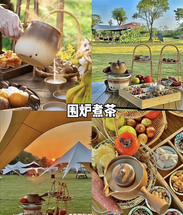 可以在自由的户外放空,多人一起围炉煮茶、露营烧烤、精致茶话会、篝火晚会、烤全羊等