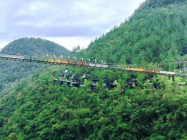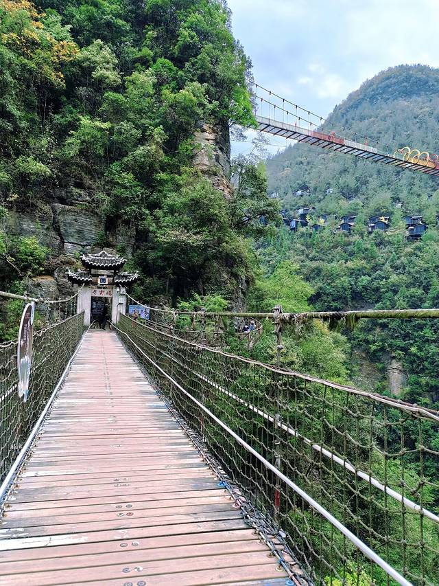 常规游览路线会先经过这座索道桥,看到右上方的玻璃桥吧,常规路线会比走玻璃桥用时多一些,距离远一些