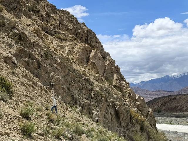 为了离得更近,我们走到栈道终点再往下的石头路上继续前行。天山山脉呈驼色, 昆仑山 脉呈黛色,走近拍照,更能贴近两山交锋的壮阔。在栈道下的石头路上走,柏油路上的一辆辆货车在山间呼啸着驶过,轰鸣声在夹道之间被放大,犹如巨物到来又被瞬间吞噬。