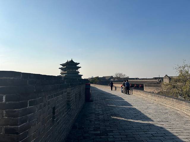城墙是平遥古城的重要景点,高约12米,总周长6163米;墙外有护城河,深宽各4米;城墙上有3000个垛口、72座敌楼,历经600余年的风雨沧桑,至今仍雄风犹存。城内街道格局为“土”字形,由四大街、八小巷、七十二条蚰蜒巷构成八卦图案。站在城墙上举目眺望,古城的景观尽收眼底。坚固的古城墙,在防御外敌侵犯的同时,还可保城内百姓平安无虞。