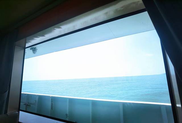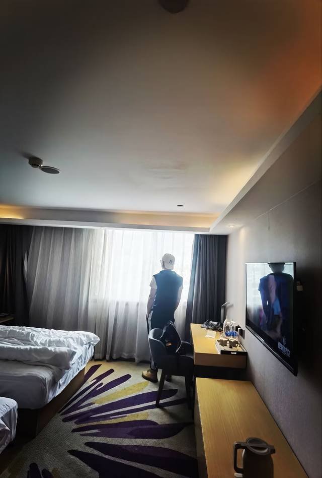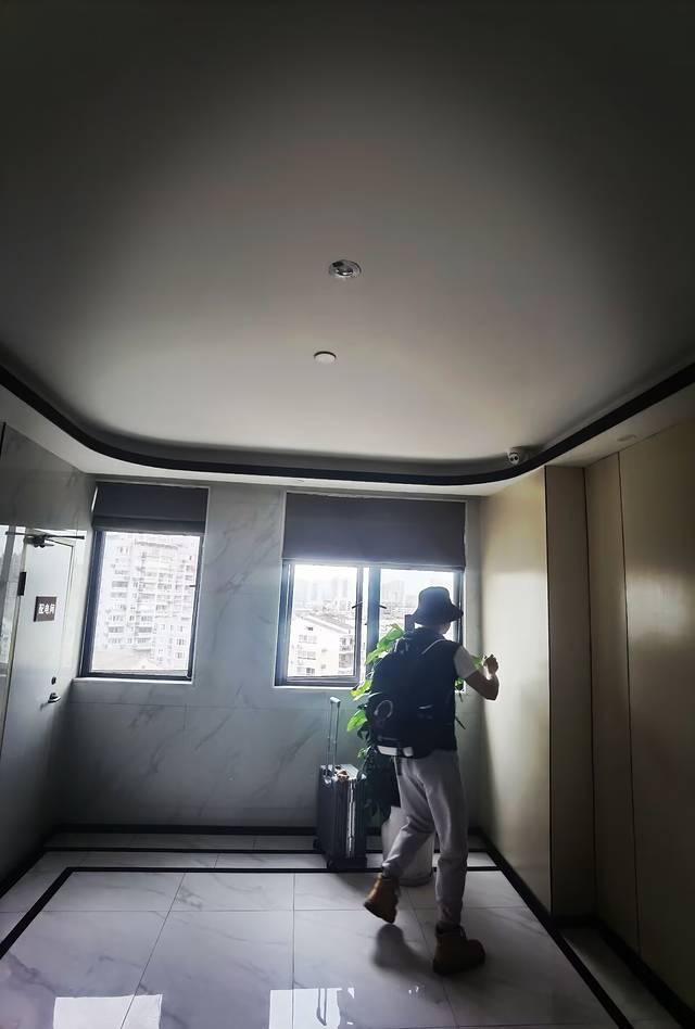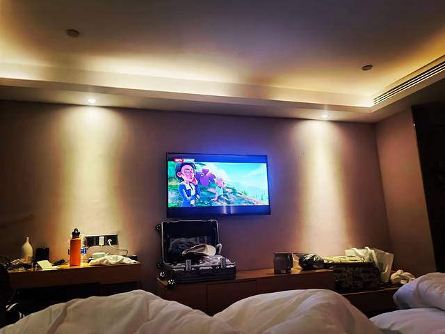 3、影院氛围,品质营造。双标客房约25平米,不算大也不算小,营造了一种有品质的家庭影院的氛围,1080p超高清投影+133寸超大客房巨幕+YAMAHA5.1环绕立体音响=私人VIP电影院,看大片绝绝子!观影体验感不错。不过客房内的布局有点不太合理、不尽如人意,显得很是拥挤。一只圆形小茶几代替了床头柜,还被电话机占领了,两个人需要充电的各种数码设备无处可放,只能放在床上,不方便也不安全,两只打开的行李箱放在过道上,影响通行,其实那只缩在窗口的沙发床和那个晾衣服的大框子没有必要,破坏了整个房间的美感,尤其是那个大框子横看竖看,总感觉很别扭,与家庭影院的风格不搭,个人认为这两件东西完全可以移除,床头柜给配齐咯,这样子整个空间就显得宽敞了,舒适度提高了、也协调美观上档次了。