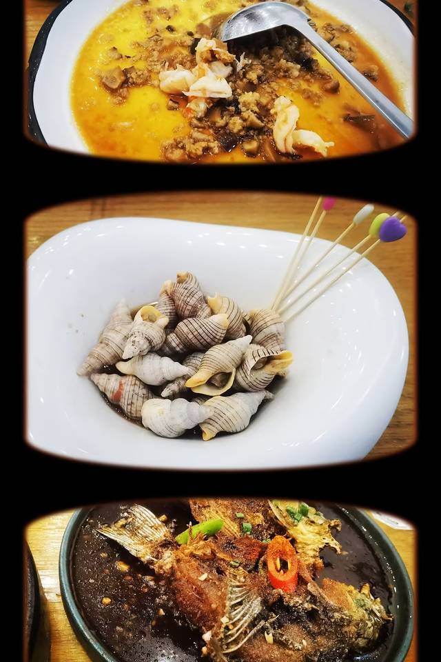 餐厅的菜系是混搭的,适合不同口味的人群,我们点的鲜虾蛋羹和捞汁小海螺这两道菜,一致认定味道不错,要给个大大的好评。就在我们感觉好好的大快朵颐的时候,香辣海鲜干锅上桌了,瞬间!感觉开始打折扣了。