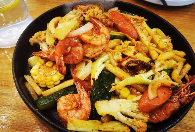 恕我们不太文明,这道菜我们兜底翻了,仔细搜寻海鲜,只找到6只虾和4条鱿鱼丝,其余的都是洋葱、花菜、黄瓜、薯条和胡萝卜等辅料,我们知道干锅类的菜有辅料,但没想到的是这道菜的辅料占比远超正料,海鲜变成是垫底的了!¥88.00元一份的香辣海鲜干锅,让我们吃出了意见,同时也对这家餐厅产生了想法,初来时的好感度一下子反转了。