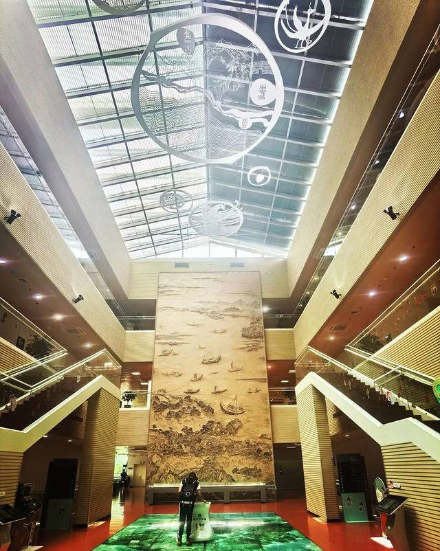 除了展厅内的这些藏品外,博物馆大厅的一幅贯穿3个楼层的巨型浮雕,千万别忽略!这幅巨型浮雕的内容取自元代宫廷画家王振鹏的作品《江山胜览图》,《江山胜览图卷》是一件可与北宋张择端的《清明上河图》媲美的纪实性风情画巨作。王振鹏是瑞安人,被誉为“元代界画第一人”,《江山胜览图》这幅画作多灾多难,被盗卖后流传国外,在2012年的北京保利秋季拍卖会上,以1.012亿元的成交价,被一位国内个人藏家竞得,重回国内,现在收藏于北京保利艺术博物馆。
