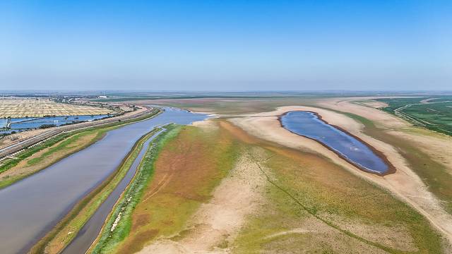 随着鄱阳湖水位的持续下降,湖区内的草洲浅滩逐渐显露出来,形成了一片片生机勃勃的湿地,这里的生态环境为候鸟提供了理想的栖息地。