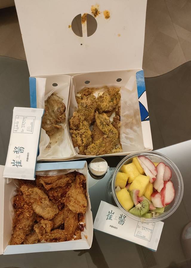 休息好了,下午茶时间到了,点一份崔酱炸鸡+甘草芭乐!炸鸡推荐银栗味和避风塘口味。水果也特新鲜!
