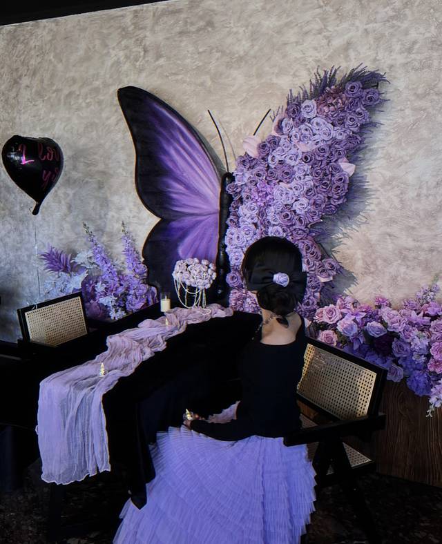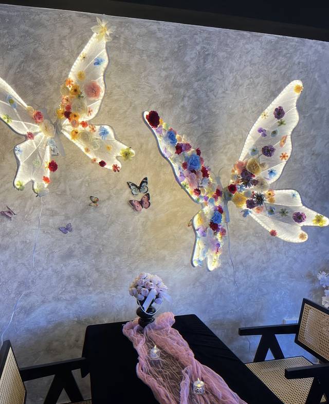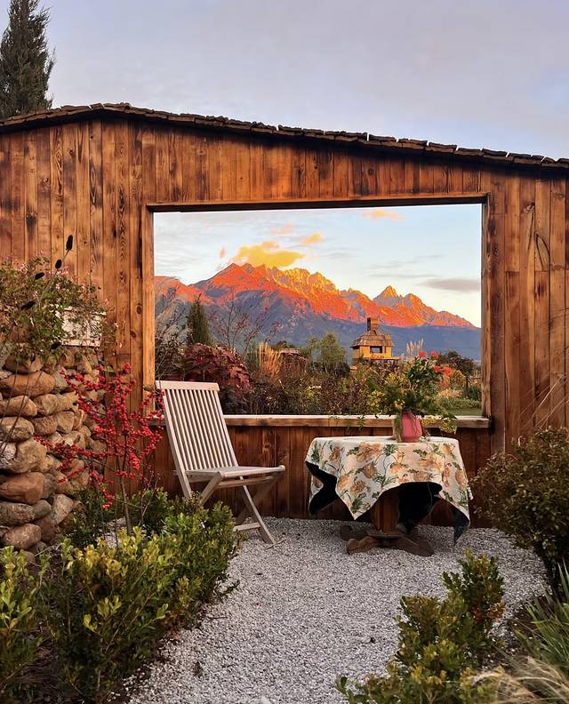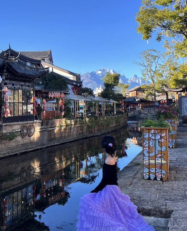 在溪边坐着看雪山拍出来的照片好松弛感!!图二是在大水车旁边的巷子里拍的哦~直面雪山早上也能看到免费的日照金山!!还找到了一家新开的蝴蝶主题餐厅