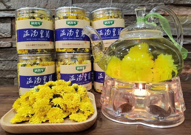 ❤温汤皇菊:生长于明月山脚下的富硒土壤中,不仅朵大,香味也更为浓郁、醇厚,初冬时节采收。有散风清热、清肝明目的功效。
