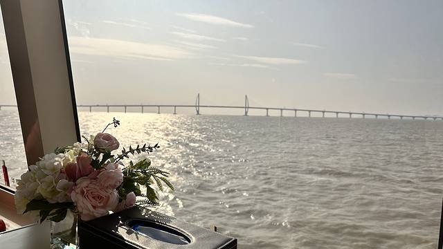 最后一天,珠海到深圳,我们在轮渡房间里观看港珠澳大桥的景色。