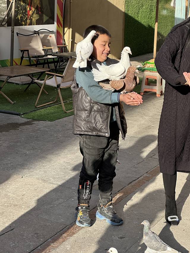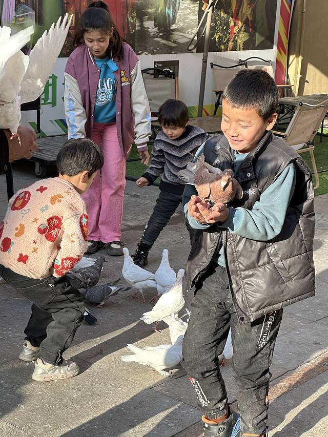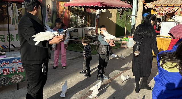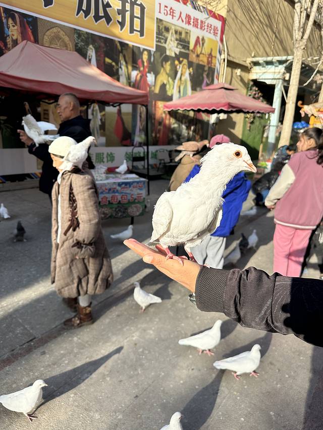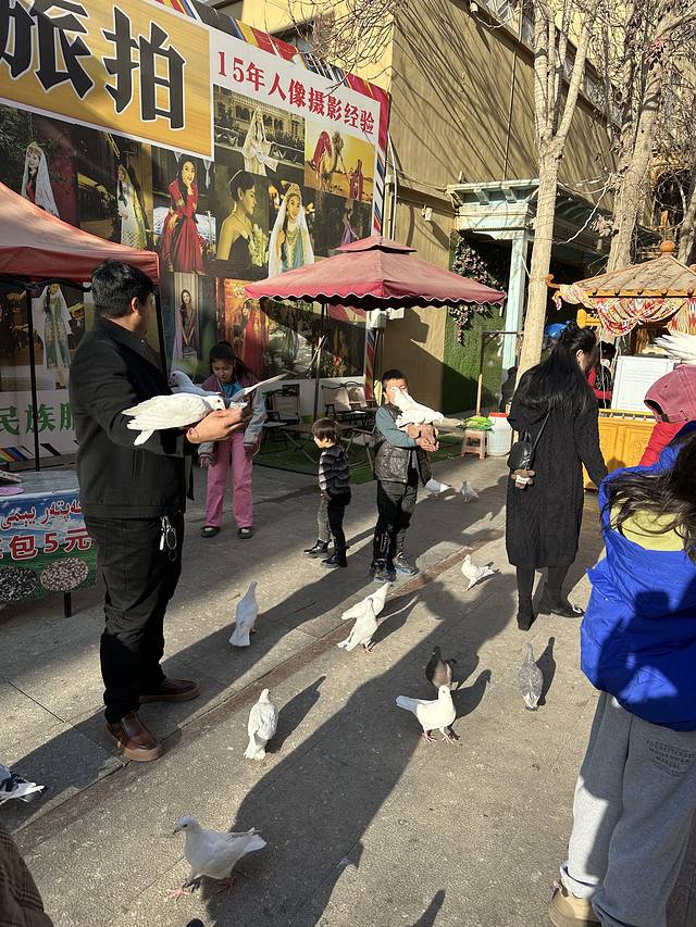 中东国家和印度尼泊尔斯里兰卡,当地人都特别喜欢喂鸽子,但是和田县团城景区这样喂鸽子的方式,第一次遇到,这里的鸽子太高级了,都是直接跑到人身上的,关键附近都是吃鸽子的餐厅,鸽子汤鸽子饭鸽子蛋是这里的特色美食!这里的鸽子,过几天就是躺在餐厅的尸体了,太惨了