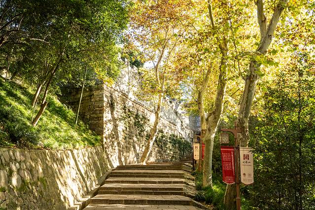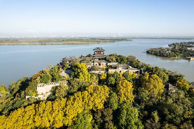 我站在山顶,远眺长江,江水浩荡,秋日的晨光中江面波光粼粼,仿佛历史的长河在缓缓流淌。金黄的树叶随风飘落,为北固山披上了一层秋日的盛装。