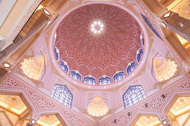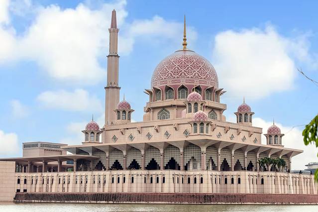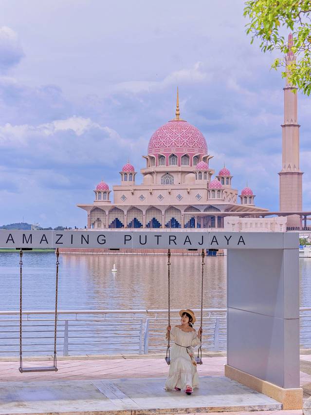布城第一站打卡地标粉红清真寺,粉色的建筑物建在水面之上真的很美! 30℃的中午,和笑妍找齐粉红清真寺的五个机位,拍到满头大汗,粉色真的很浪漫很好拍!这座粉红色的清真寺是马来西亚布城的标志性建筑之一,因其顶部花岗石砌成的粉红色屋顶让人过目不忘,距离吉隆坡市区20公里,三十四分钟车程,其主体建筑有四分之三建在水上,可以容纳15000人一起祈祷。