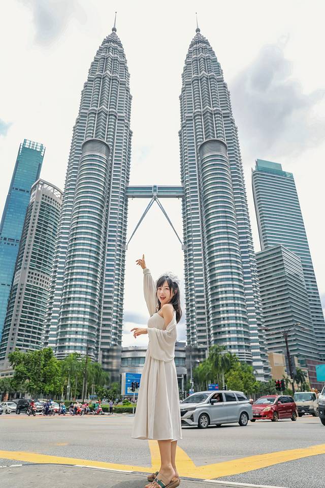安全岛→推荐理由:这个打卡点是通过Google maps搜索public bank找到的。银行门口的十字路口有等红绿灯的岛台,可以拍到双子塔全景,又不会拍到太多人群。不过靠近马路时一定要注意安全,马来西亚的摩托车非常多,开得也很快。