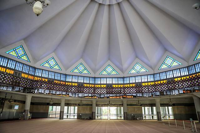 国家清真寺像一把打开的大伞,白色的伊斯兰建筑风,屋顶由49个大小不等的圆拱组成,呈18条放射星芒。在祈祷大厅的旁边就是大尖塔,塔尖的形状像火箭,高73米。寺内无空调,但走进去感觉神清气爽,赤脚踩着地面,进入祈祷大厅前要经过一个宽阔的厅堂。一位当地阿姨对我说,来这里要捧起双手向阿拉祈祷,给与自己和家人得到好的东西,虔诚期待好的事情发生。