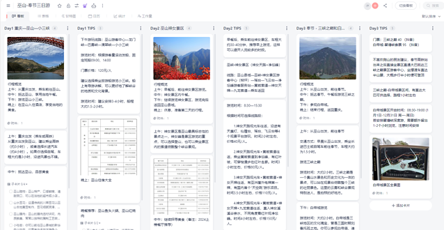 在旅游出发前,利用好看板工具搭建一个完备的旅游攻略是十分有必要的,关于本次旅游行程的整理都是在板栗看板上完成的,这样一个旅游备忘录十分方便我们在旅行过程中随时查看。