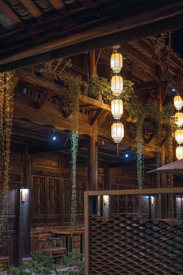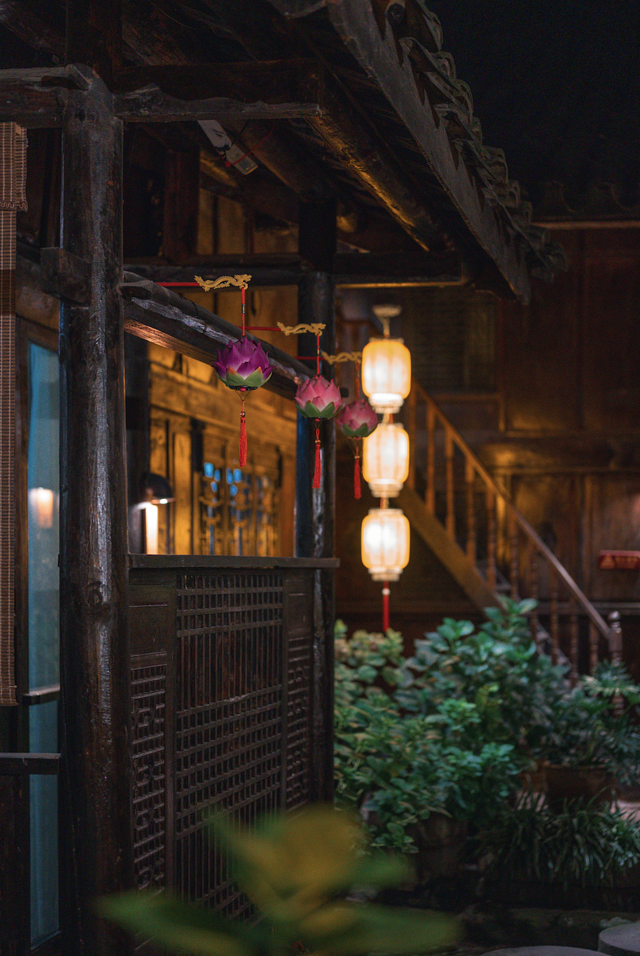 虽然是在晚上,也不难看出院子里种满了各式各样的花草树木,一股清新自然的气息萦绕身边。楼台上的吊兰垂在走廊上,典雅至极,在暖黄色灯光下,更添了几分古韵。