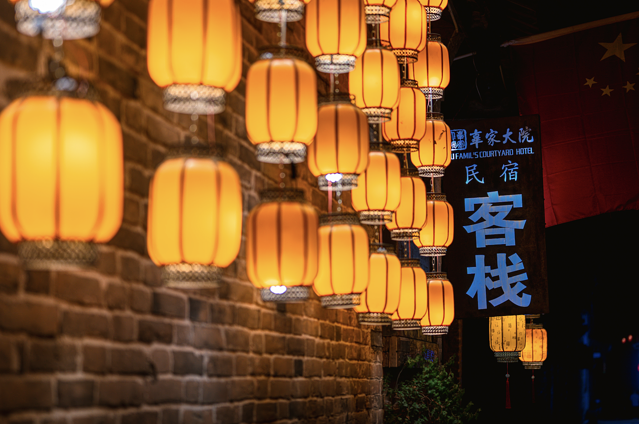 灯光把人的影子拉得老长,仿佛走过这条小巷,就能穿越时空。
