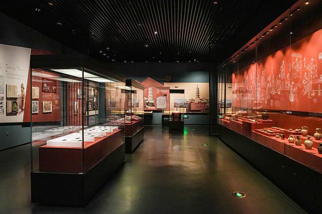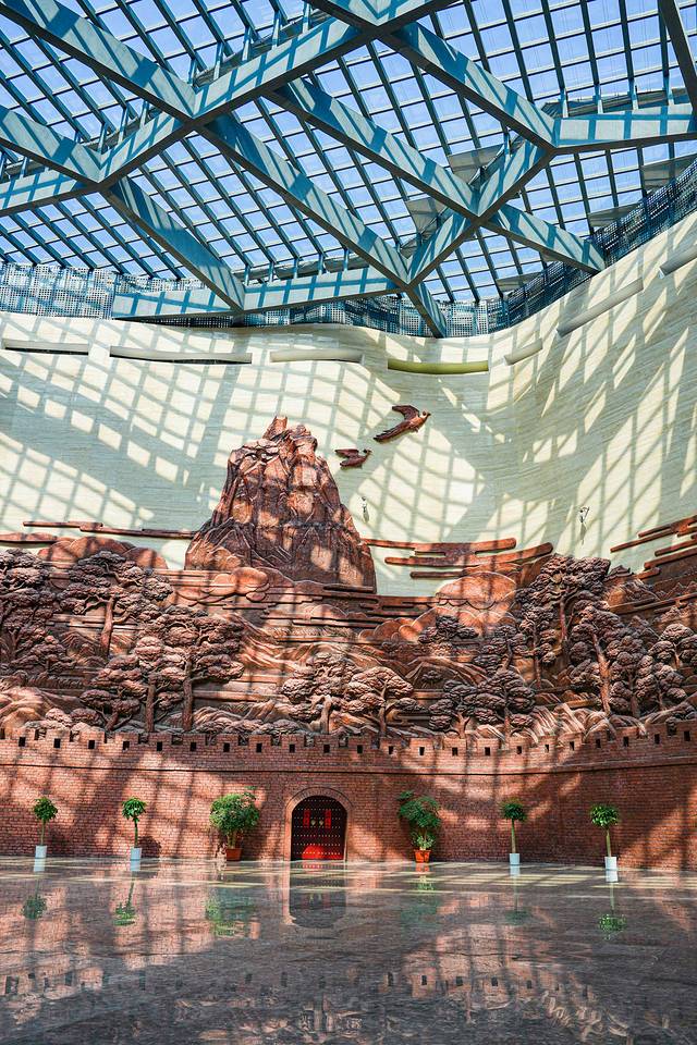 走进博物馆,夺人眼球的是一座气势恢宏的“徽派天井”,它采用玻璃采光顶的钢架构造,宛如一幅透明的画卷,大厅内墙上的天柱山浮雕,细腻地刻画着古城的岁月痕迹,每一砖一瓦都诉说着往昔的故事。