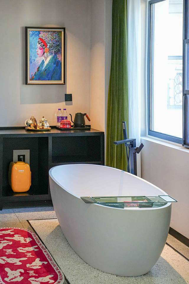 房间内采用自然的木质色调,营造出复古而富有质感的氛围。古雅的床榻搭配慕思床垫,睡起来很舒适。同时,配备智能客控系统、智能马桶和浴缸等设施,逛完一天疲惫的身躯在这里得以放松。